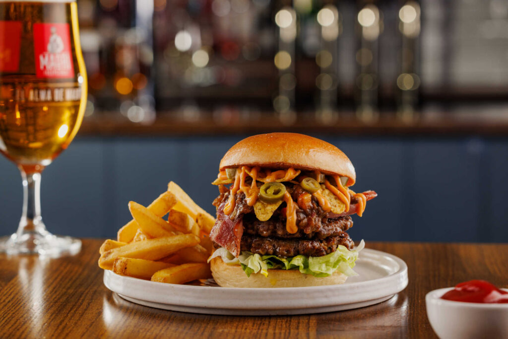 Classic burger, two 3oz beef patties with burger sauce. Served in a toasted brioche-style bun with chips | 10.49 1378 kcals
