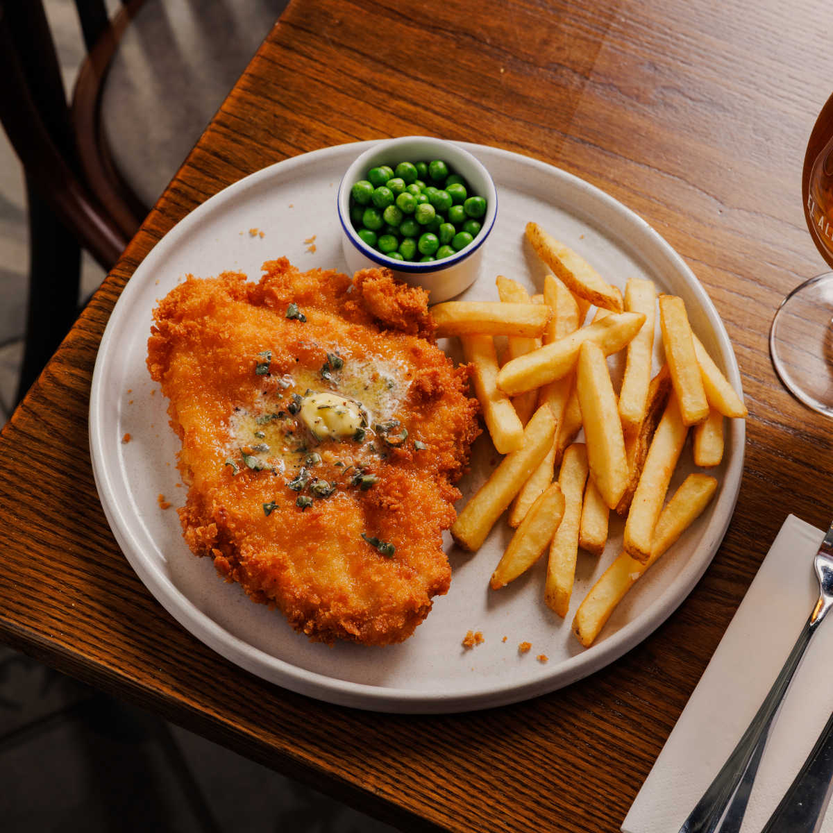 Crispy chicken schnitzel, breaded chicken topped with garlic butter, with chips and garden peas | 11.99 1364 kcals