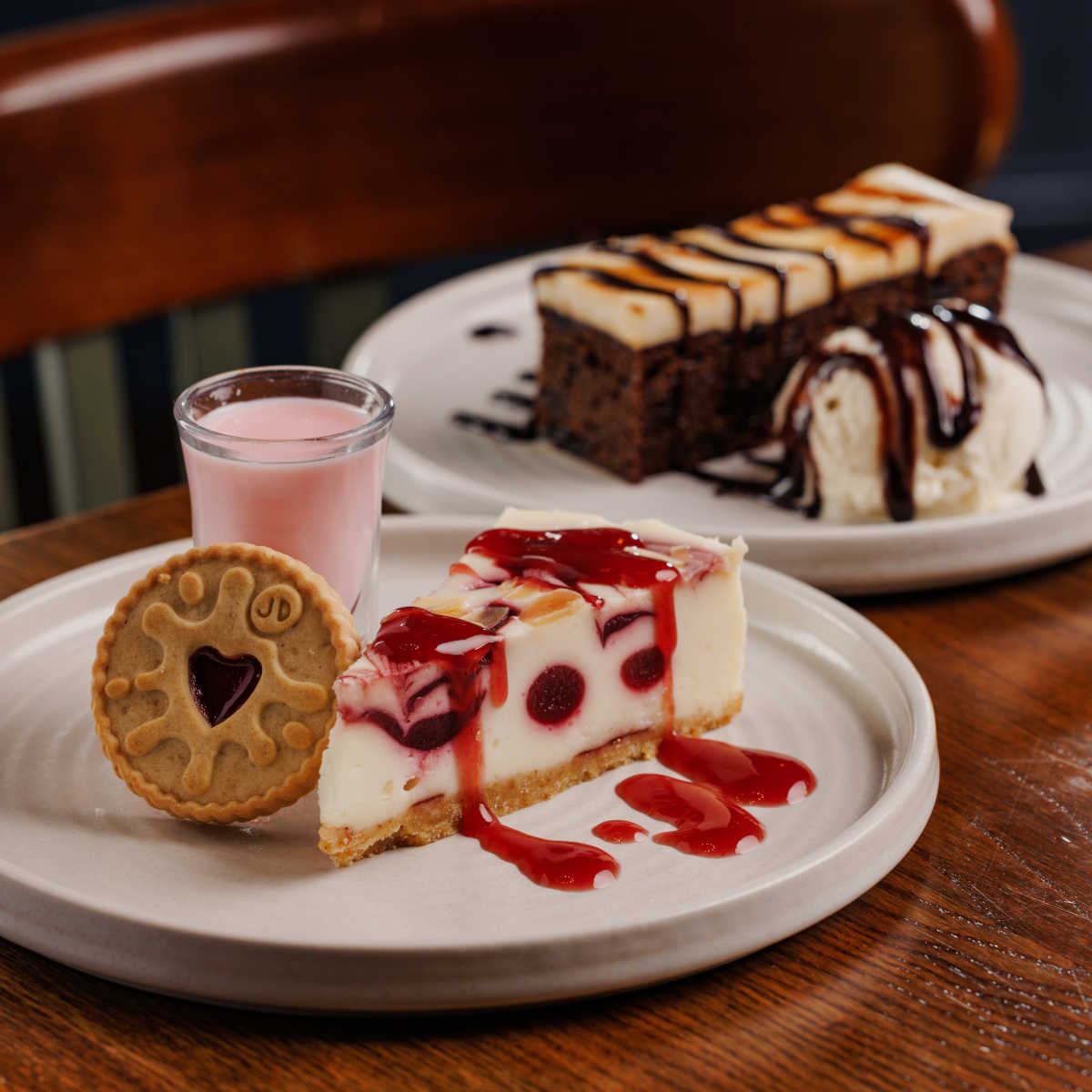 Jammie dodger cheesecake, raspberry & cherry cheesecake topped with almonds, with a boozy raspberry shot on the side (contains alcohol) (v) | 5.99 601 kcals