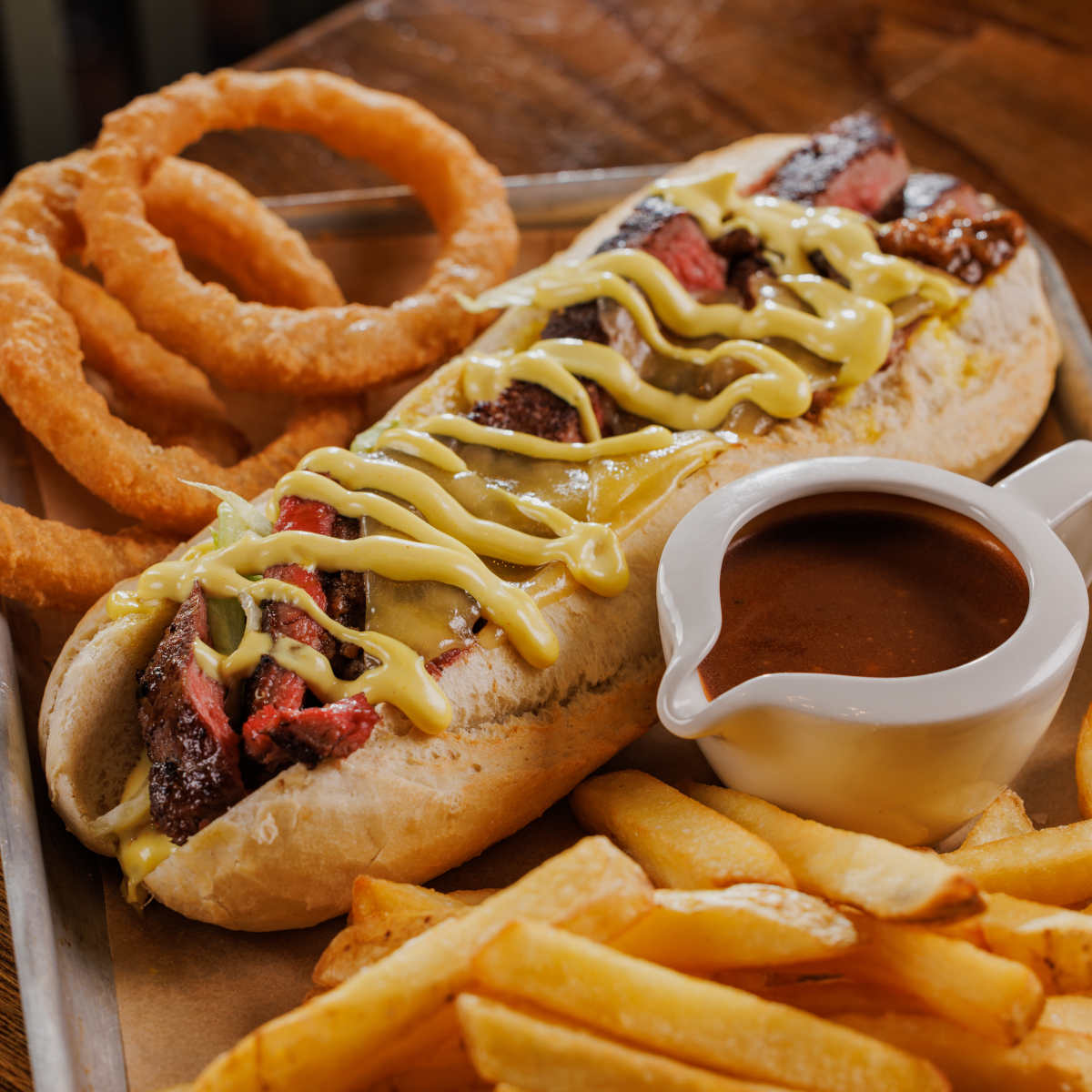 Ultimate steak dipper, steak, melted cheese and rich beef gravy in a crusty baguette, with crispy onion rings, chips and a pot of gravy for dipping | 13.49 1886 kcals