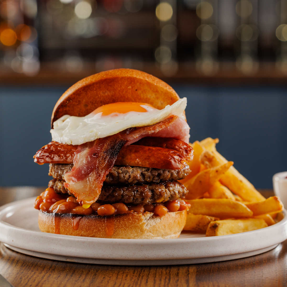 Big breakfast one, two 3oz beef patties, bacon, sausage, hash browns, free-range fried egg and baked beans | 13.49 2034 kcals